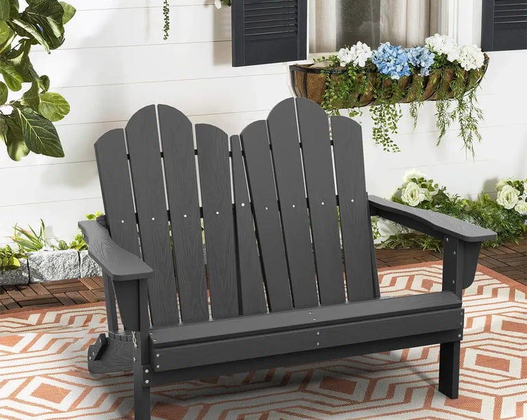 It features comfortable two-person seating, an ergonomic Adirondack backrest, and a foldable design for easy storage. Made from weather-resistant HDPE, it withstands sun and rain with minimal maintenance, making it ideal for patios, gardens, and backyards.